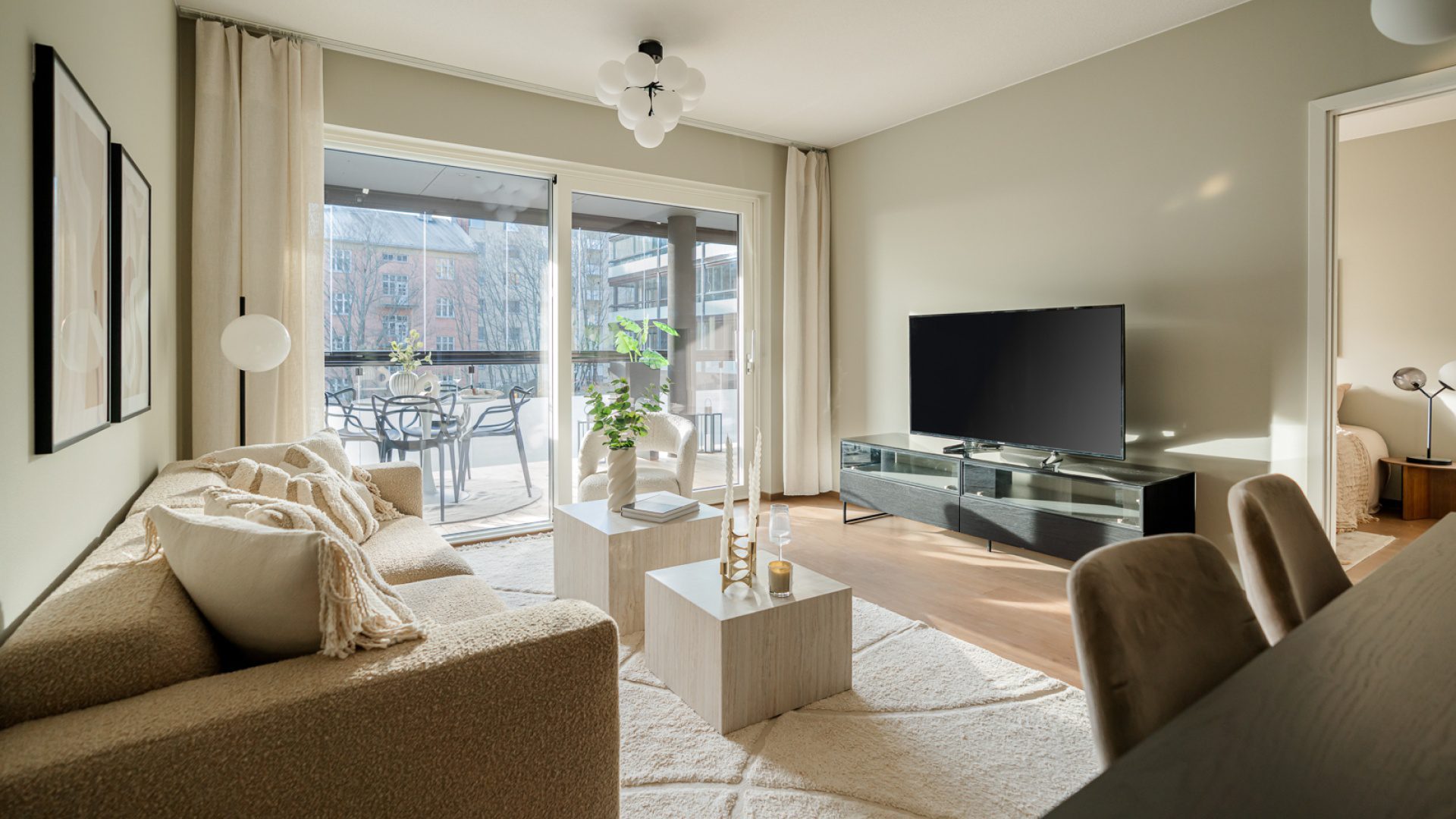 - Taloyhtiön tunnelmallinen olohuone, jossa kotiteatterijärjestelmä